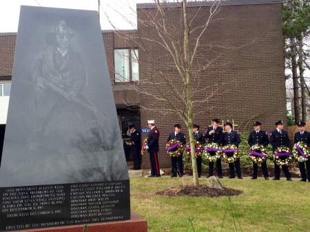 The service was held at The Firefighters Monument. It was erected by the Halifax Fire Department to honour the nine members of their department who lost their lives in the explosion while racing towards the burning ship, Mont-Blanc.