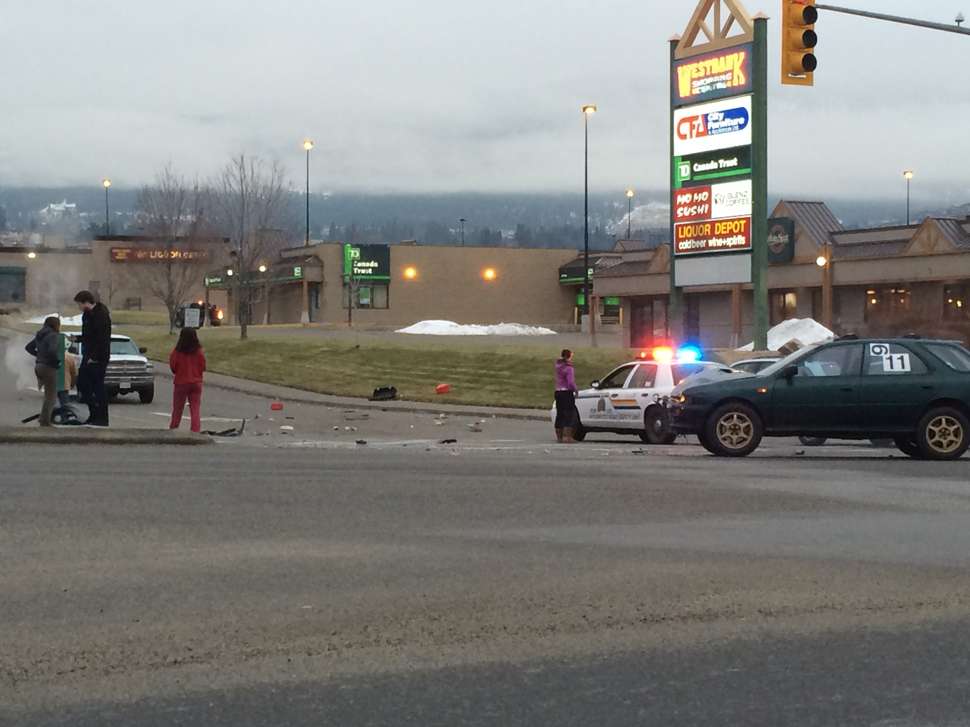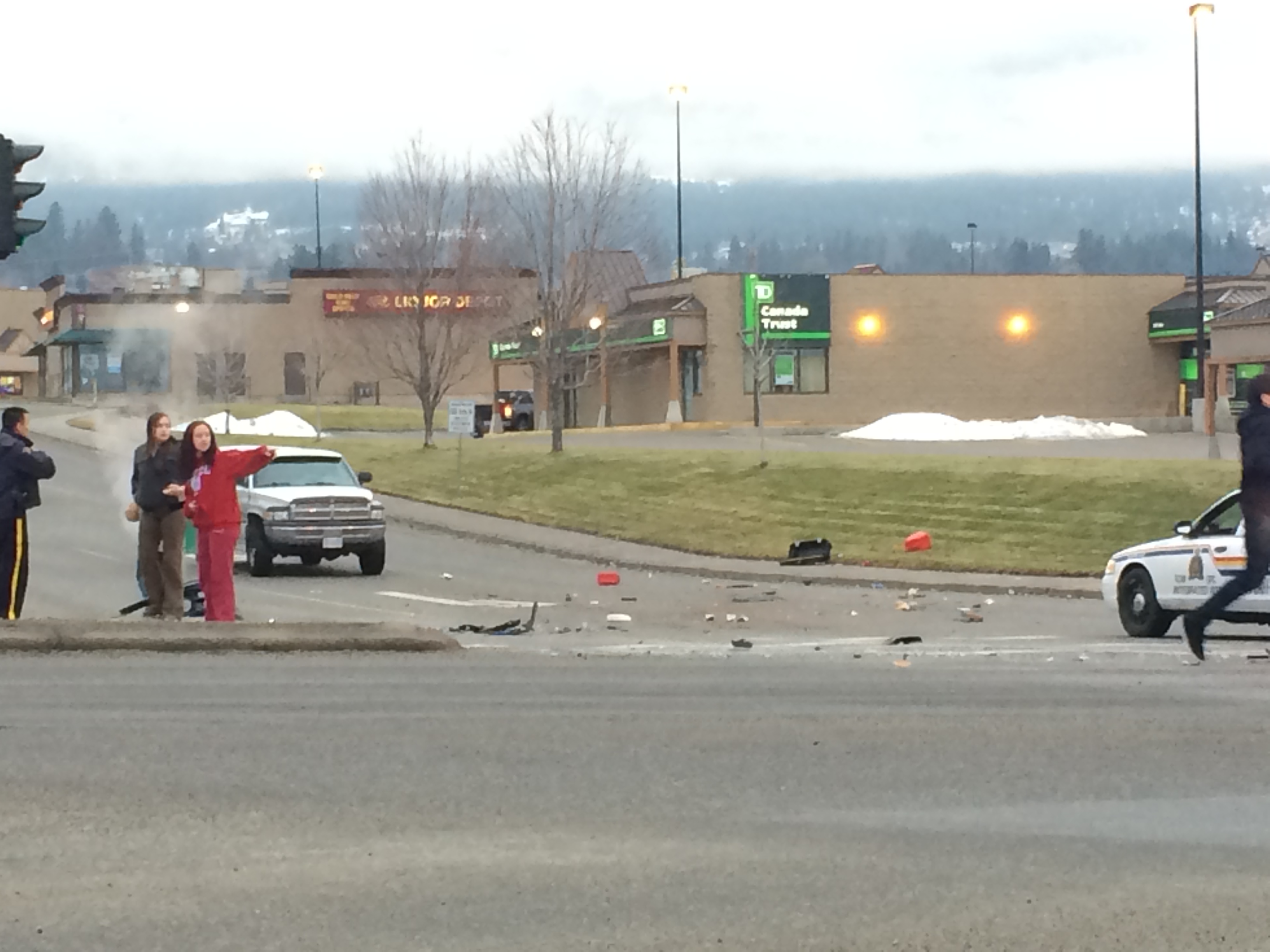 The crash happened at the intersection of Gosset Road and Highway 97 — across from Gellatly Road — where a blue Dodge Dakota ran a red light — hitting two vehicles and clipping a third.