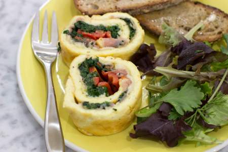 EGG ROULADE STUFFED WITH PROSCIUTTO, SPINACH AND ROASTED RED PEPPER
