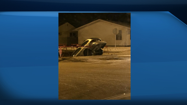 Police were called to 3rd Avenue NE and Athabasca St E where a vehicle slid thru the barricades and ended up in a hole that the city excavated for underground work.