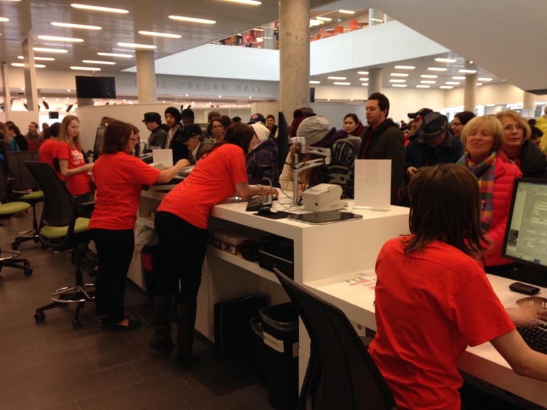 Library staff who were inside eagerly awaited for the doors to open, with some peering out at the crowd from the windows.