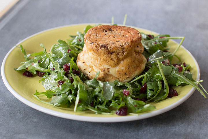 To serve, in a bowl toss the arugula and dried fruit with some of the dressing. Divide the arugula between 6 serving plates, making a hole in the centre of each for the souffles. Run a knife around the edge of each souffle to loosen it, then gently invert it onto a towel and re-invert it into the middle of each salad. Serve immediately.