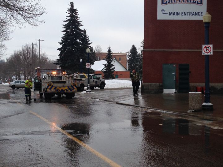 EPCOR says a pipe in the mechanical room burst, causing water to come pouring out the door and into the parking lot. Water streamed down 96 Avenue and onto 101 Street, which may make for icy road conditions into Saturday evening.