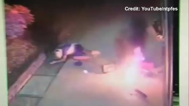 He then lights his explosive, but evidently didn’t leave much of a fuse. The resulting explosion is almost instant, blowing the would-be thief right out of his flip flops.