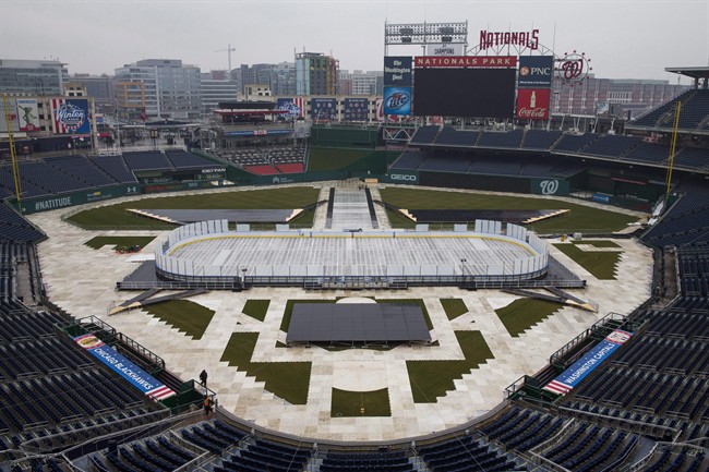 On Tuesday, the ice had sun on it until just before 2:30. The height of the stands at Nationals Park actually helps reduce the amount of time the sun is on the playing surface.