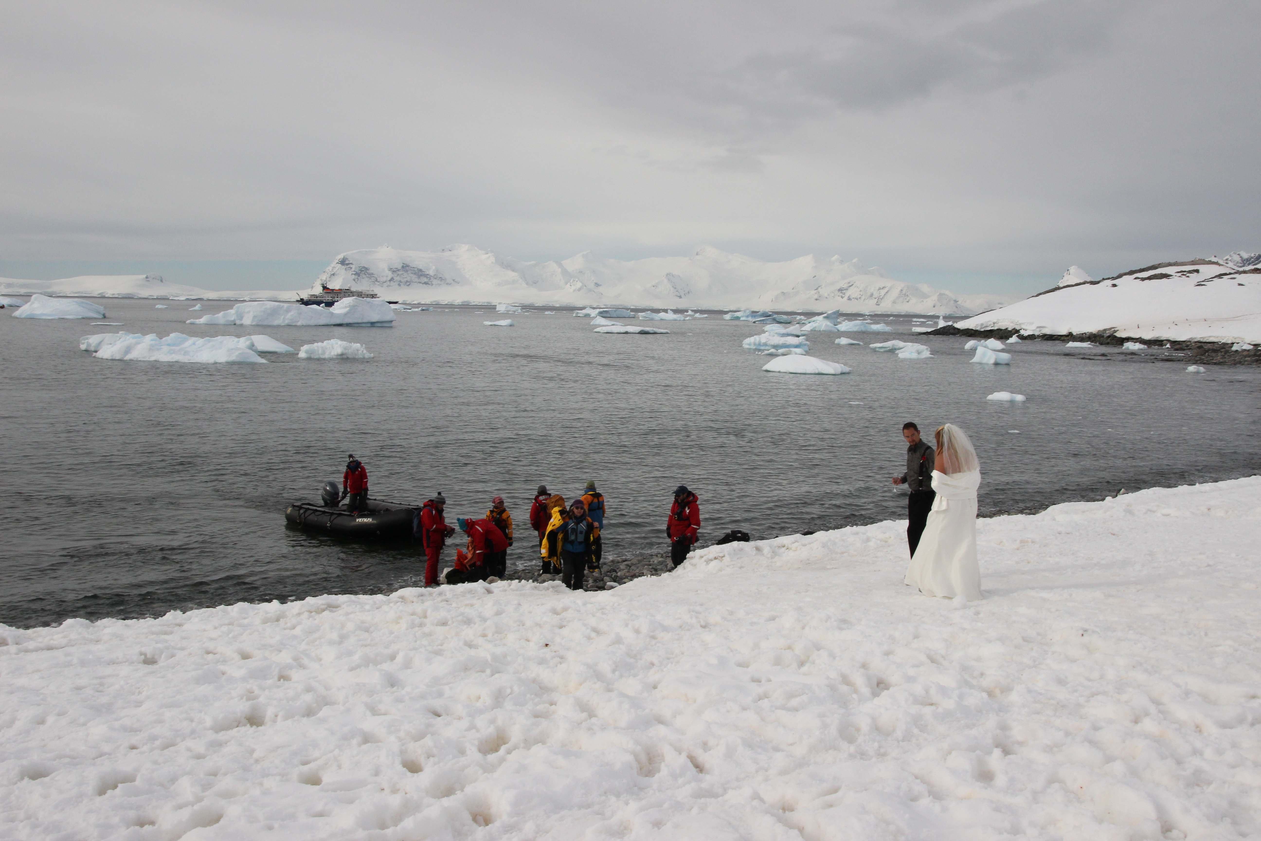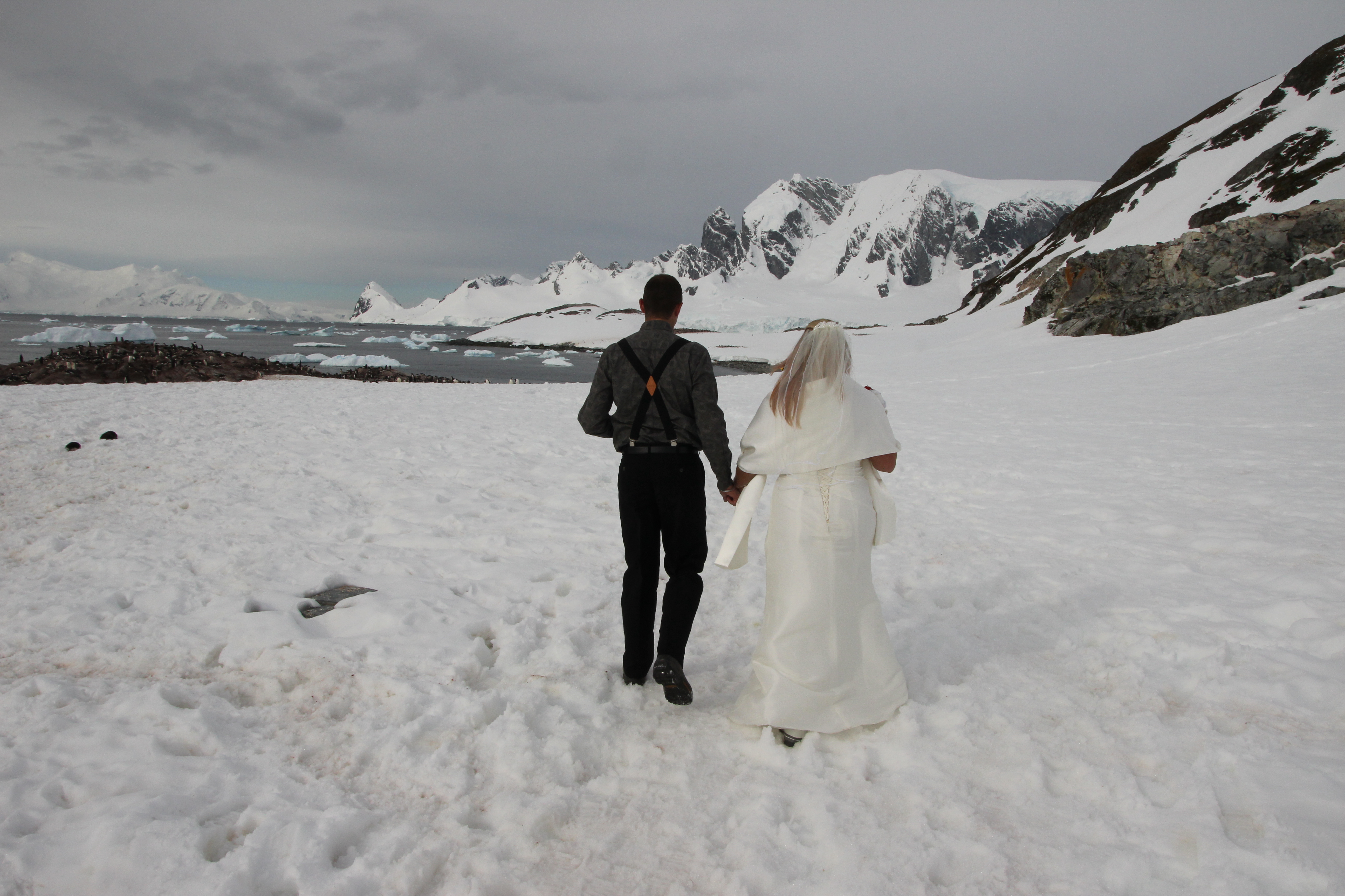 Lewis, who works as a tour guide operator with Catharine, says the two of them wanted to get married in a place they normally wouldn’t have a chance to travel to in their work. She brought an inexpensive wedding dress for their planned Antarctic trip just in case it could take place.
