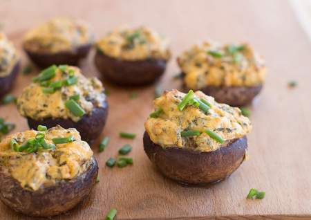 Nutrition information per mushroom: 80 calories; 45 calories from fat (56 per cent of total calories); 5 g fat (3 g saturated; 0 g trans fats); 25 mg cholesterol; 3 g carbohydrate; 1 g fiber; 1 g sugar; 6 g protein; 250 mg sodium.