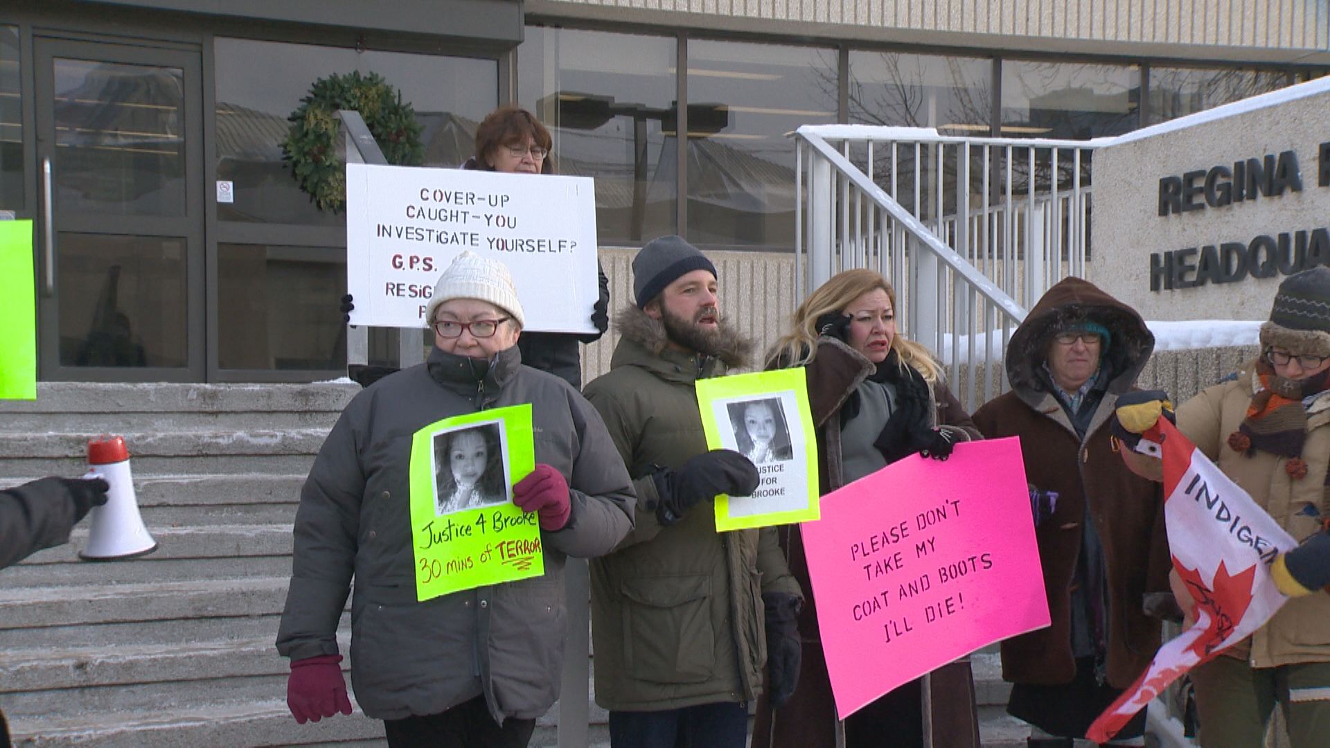 REGINA – Allegations against two city officers travelled from the online world to the front steps of the Regina Police Service headquarters Wednesday.