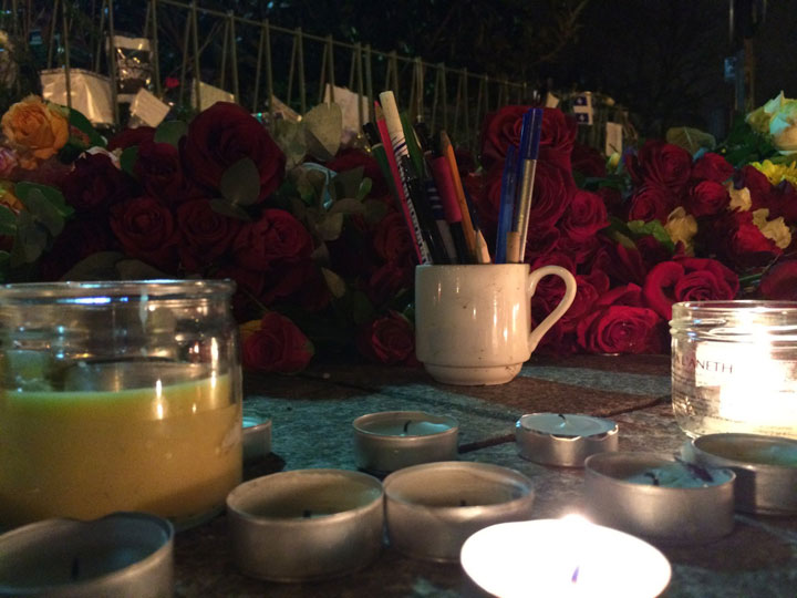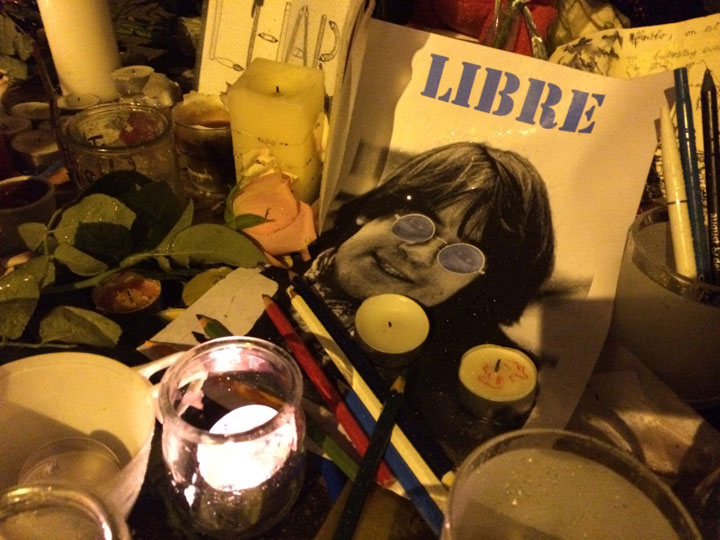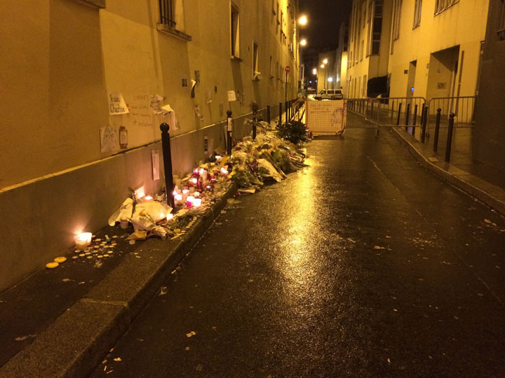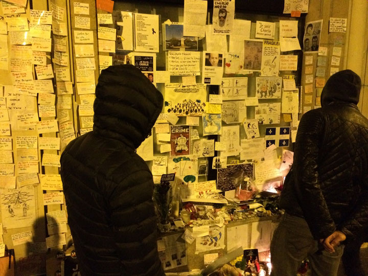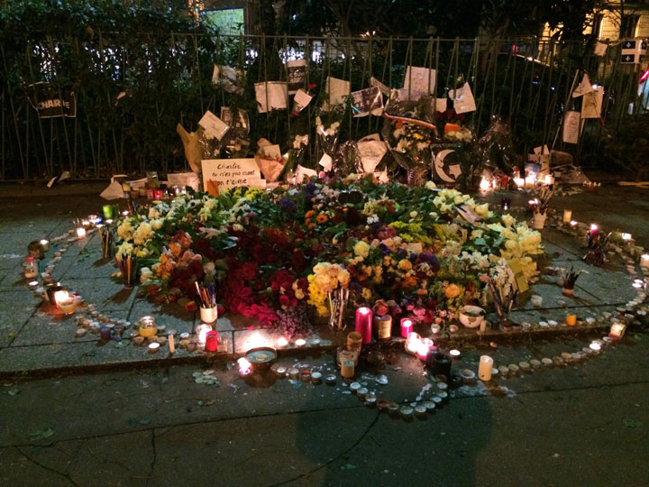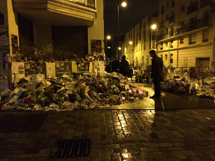 We walk outside and towards the main memorial to the Charlie Hebdo victims on rue Nicolas Appert.