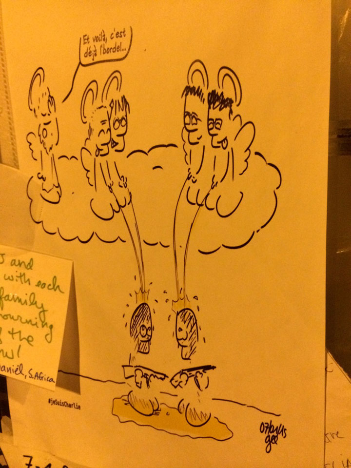 Another shows the slain Charlie Hebdo cartoonists, now angels in heaven, pissing on the heads of their murderers: “Et voilà, c’est déjà l’bordel …”