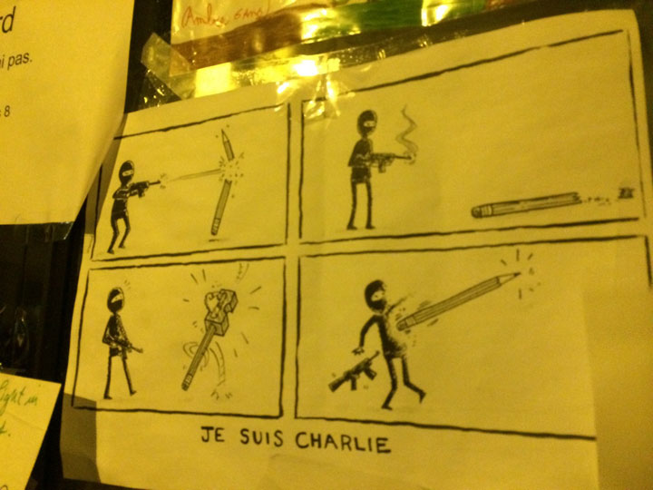 Anger and retribution are mingled among the tributes. Grieving cartoonists exact their revenge by posting drawings at the crime scene.