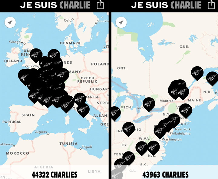 “Because ‘I’m Charlie’ became the symbol of freedom of expression, whatever your beliefs, your country and your opinions, download the app ‘I’m CHARLIE’ and simply mark your location on the world map,” reads the app’s description in the app store.
