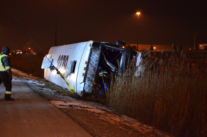 Ontario Provincial Police say 56-year-old Radika Nankissoor died after the eastbound bus hit a guard rail near Weston Road and rolled into a ditch just after 10 p.m. Wednesday.