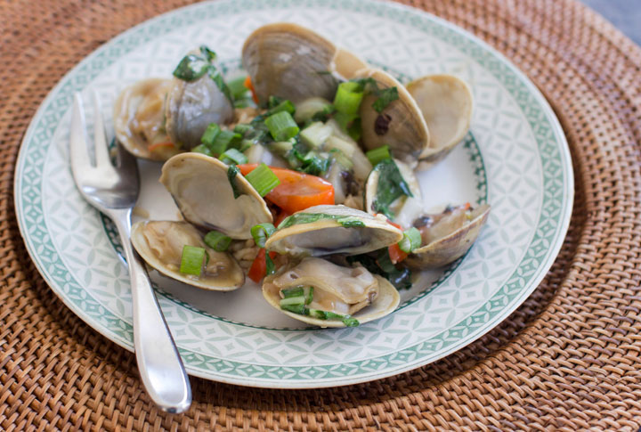 According to Rick Moonen, one of my favourite seafood chefs, most clams these days are cleansed of excess sand before they’re sold. But if you suspect that your batch might be quite sandy inside, soak them in heavily salted water (1/4 cup coarse salt for each quart of water) for 30 minutes. Then, just before cooking the clams, scrub them well with a brush under cool running water until the shells feel clean and sand-free.