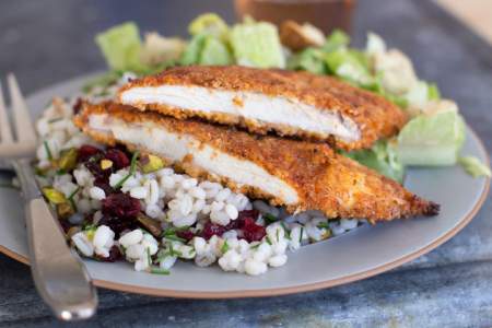 While you could quickly pan-fry these breaded cutlets, I like to ease of the oven. Very fast and no mess. What happens next is up to you. I like to eat them just as is, but you also could slap the cutlets between slices of sourdough bread with a bit of mayo. They also are terrific sliced and tossed with a Caesar salad, or mounded over a pile of barley.
