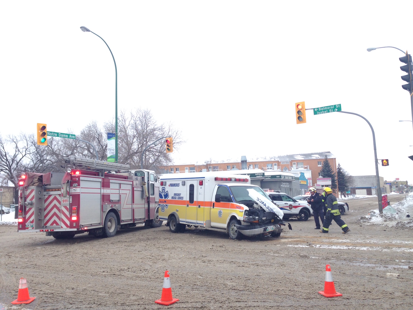 Police say that a Winnipeg Fire Paramedic Service ambulance was driving westbound on Notre Dame Avenue and was close to a green light at Isabel Street.