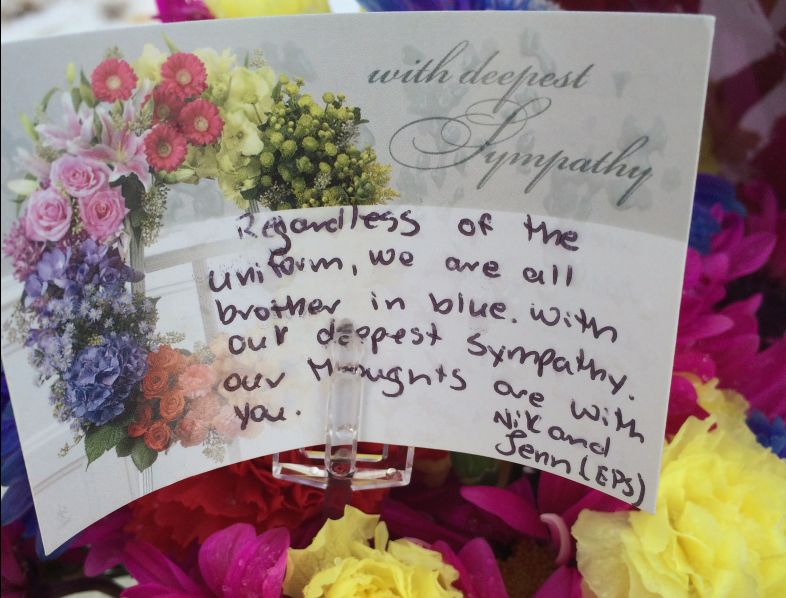 “Regardless of the uniform, we are all brothers in blue,” reads one note left on a bouquet. “Our deepest sympathy. Our thoughts are with you.”