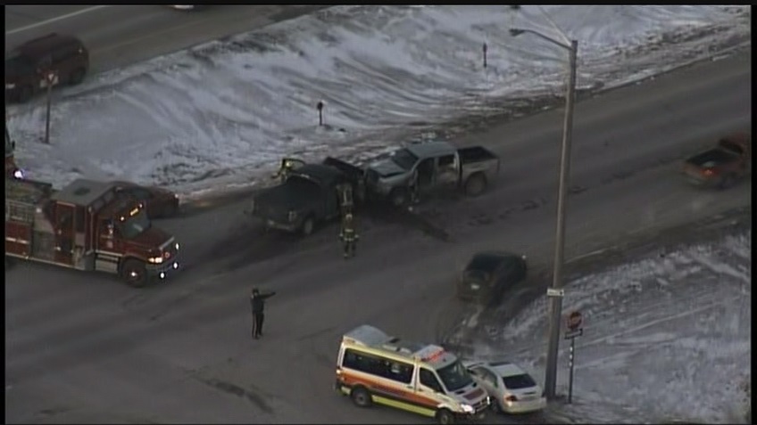 RCMP responded to the collision between Dunning Road and Garven Road just before 5 p.m. Thursday. RCMP initial reports are that the two pickup trucks collided head on in the northbound lane.