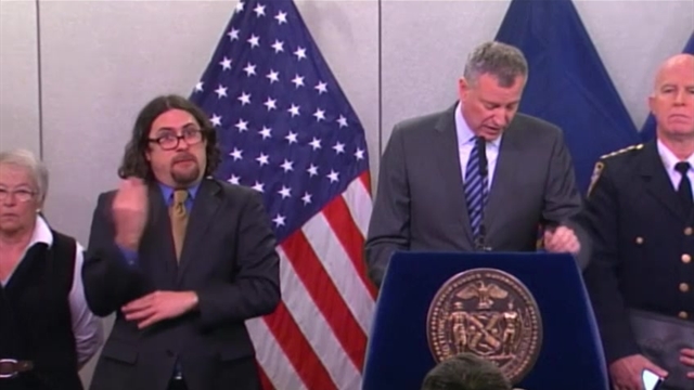 Lamberton said the way he signs is more accessible to a wider swath of deaf people. The freelance interpreter first worked with the city a few months ago when Ebola was being discussed. He works with a hearing partner who translates what is being said into ASL, which Lamberton then puts into a form that’s broadly understandable. At some of the recent mayoral briefings, that partner happened to be his wife.