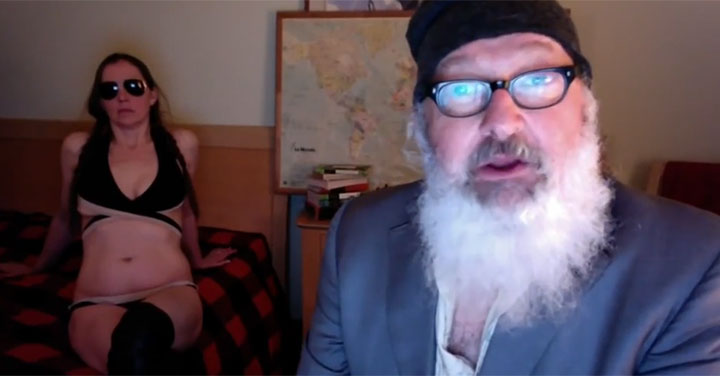 “Evi and I have been put through a living hell of biblical proportion,” he says, before Evi puts the masks on and the couple simulates sex.