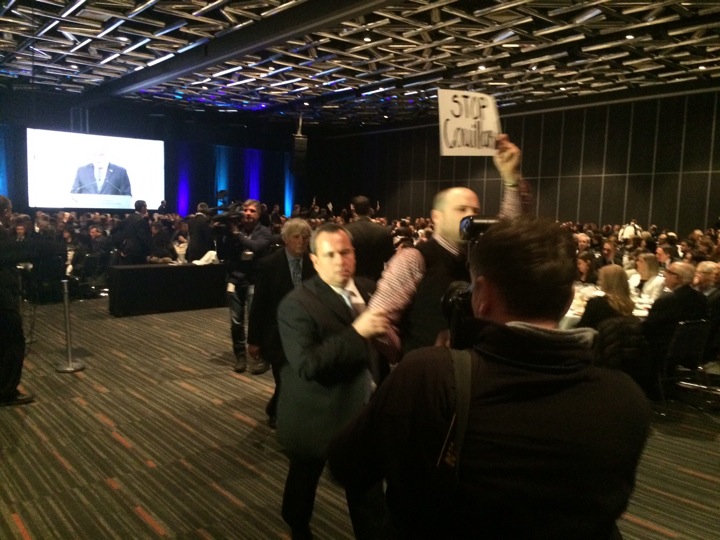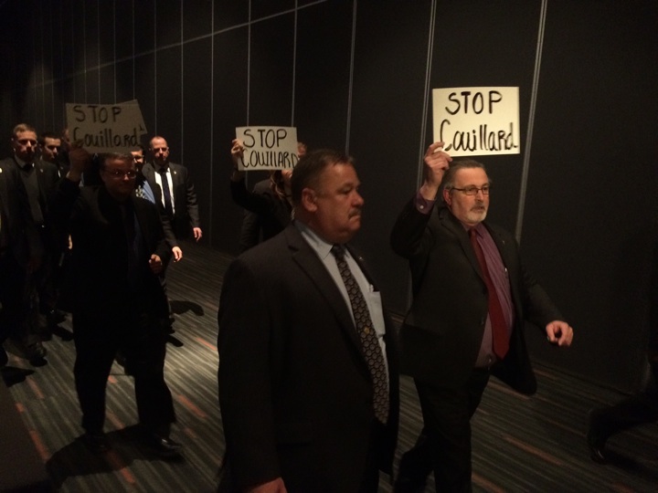 MONTREAL — Just as Quebec premier Philippe Couillard settled into a speech on the economy, about a dozen protesters tried to break it up shouting “Stop Couillard,” and carrying signs that read the same.