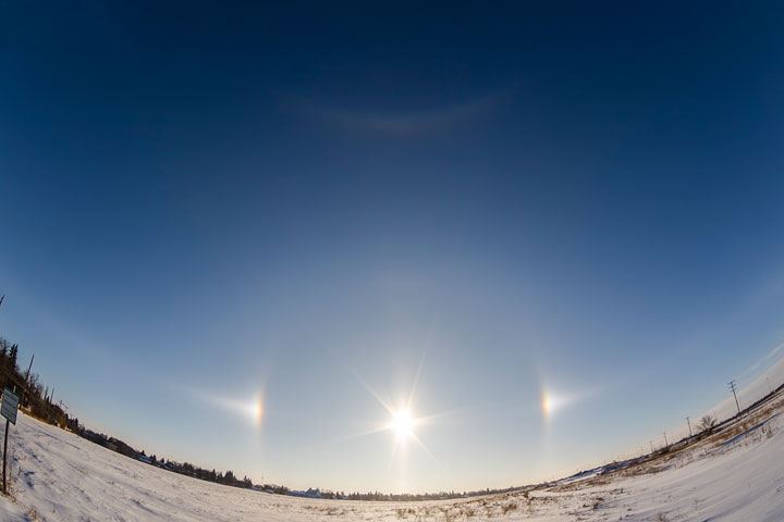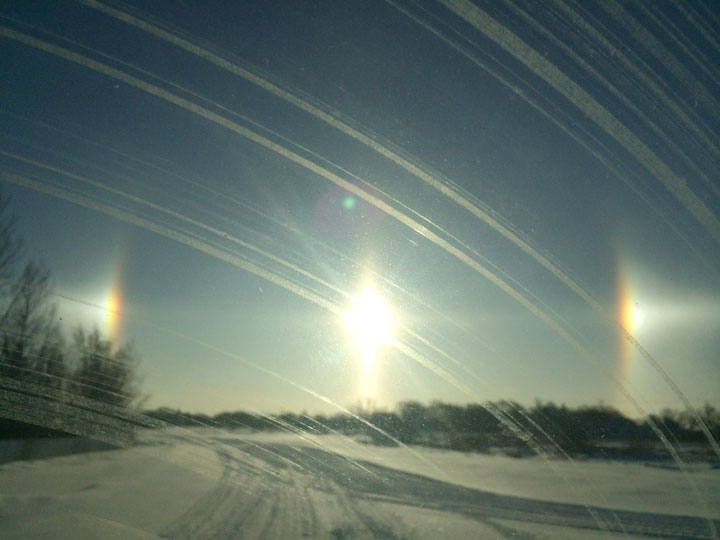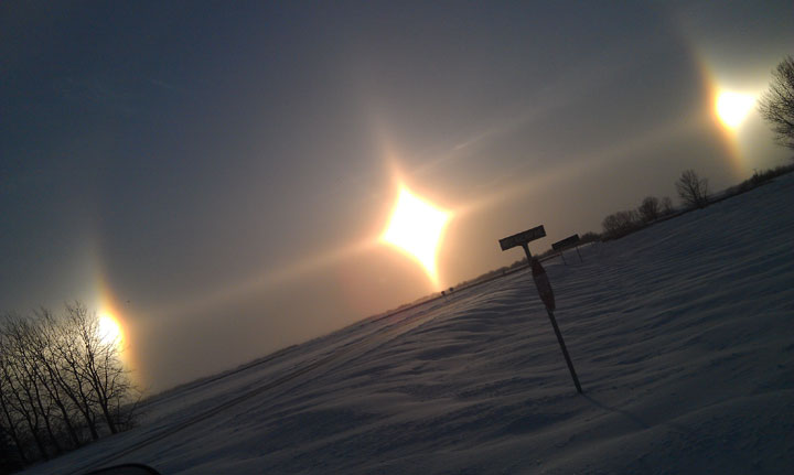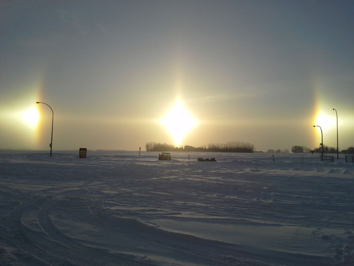 According to Environment Canada, sun dogs are luminous spots of light appearing of either side of the sun when its rays shine through ice crystals floating in the air. This illusion is also known as parhelia or mock suns.