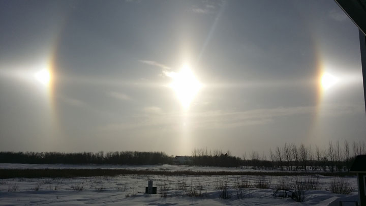 Saturday’s sun dogs occurred after a day full of winter weather warnings in the area where approximately nine to 15 centimetres of snow fell.