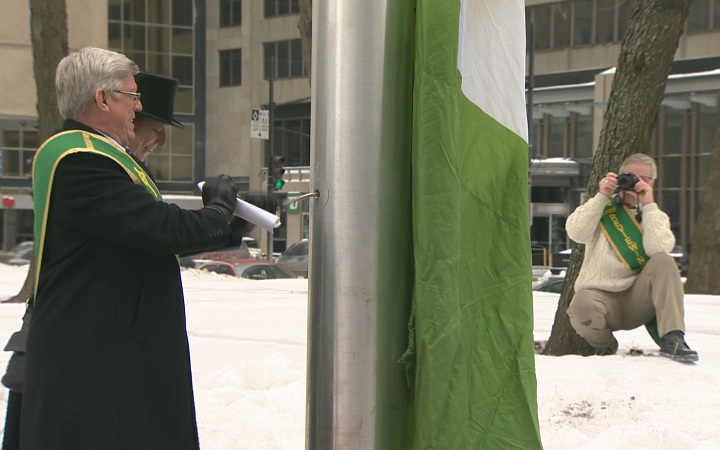 On Tuesday, the United Irish Societies raised the Irish community flag at Place Ville Marie in downtown Montreal.