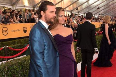 McConaughey wore a dark purple tuxedo to the Golden Globes and a brassy blue blazer to the Screen Actors Guild Awards.