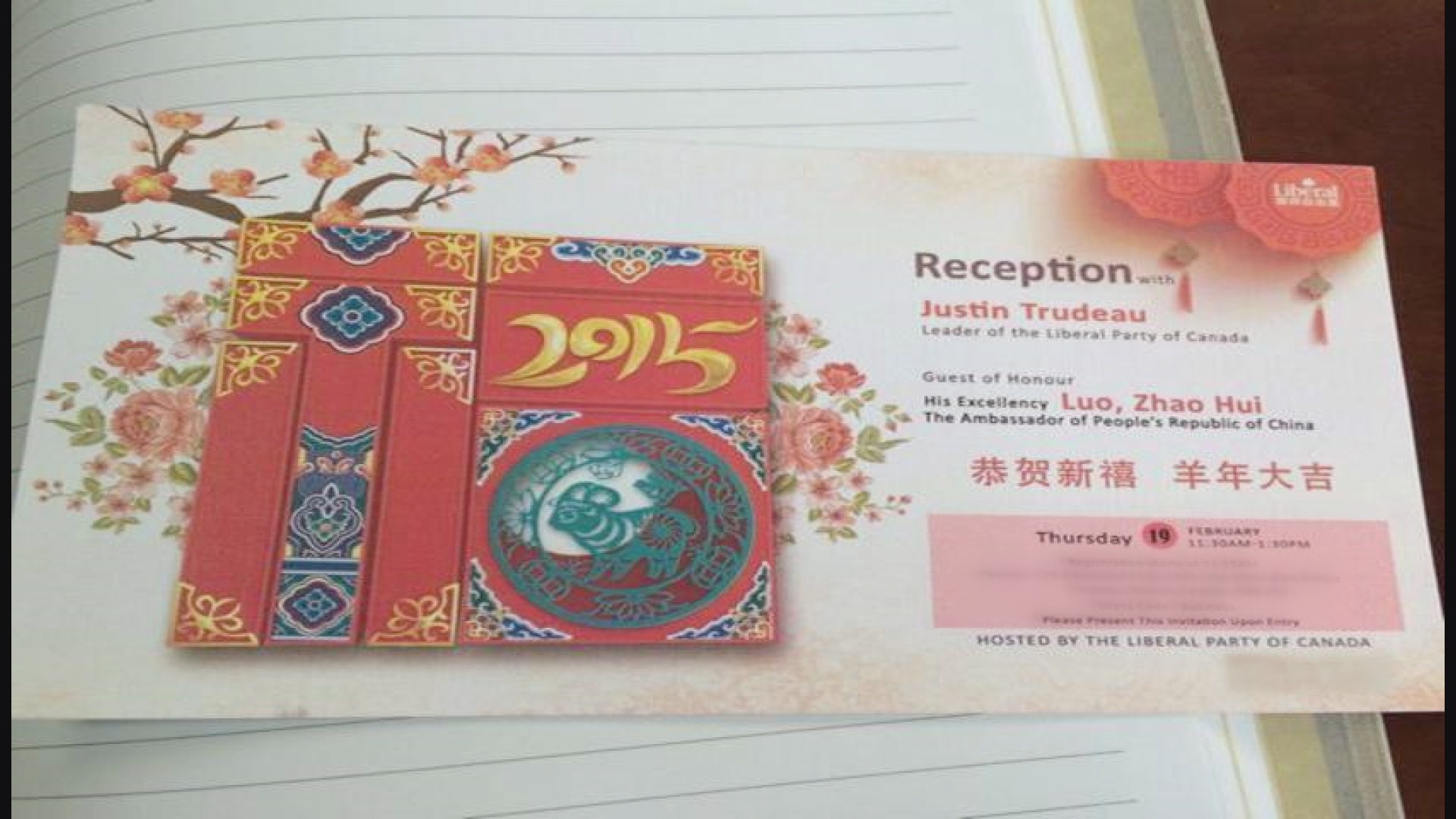 An invitation for a reception with Liberal leader Justin Trudeau at the Boulevard Club in Toronto on Thursday features Chinese ambassador Luo Zhaohui as the “guest of honour.”
