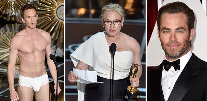 At one point in the show, Neil Patrick Harris spoofed Michael Keaton in Birdman by coming out on stage wearing only a pair of “tighty-whiteys” — and proved that he really is the whole, er, package. Later, director Alejandro G. Iñárritu joked that he was wearing Keaton’s briefs for good luck — and they “smell like balls.”