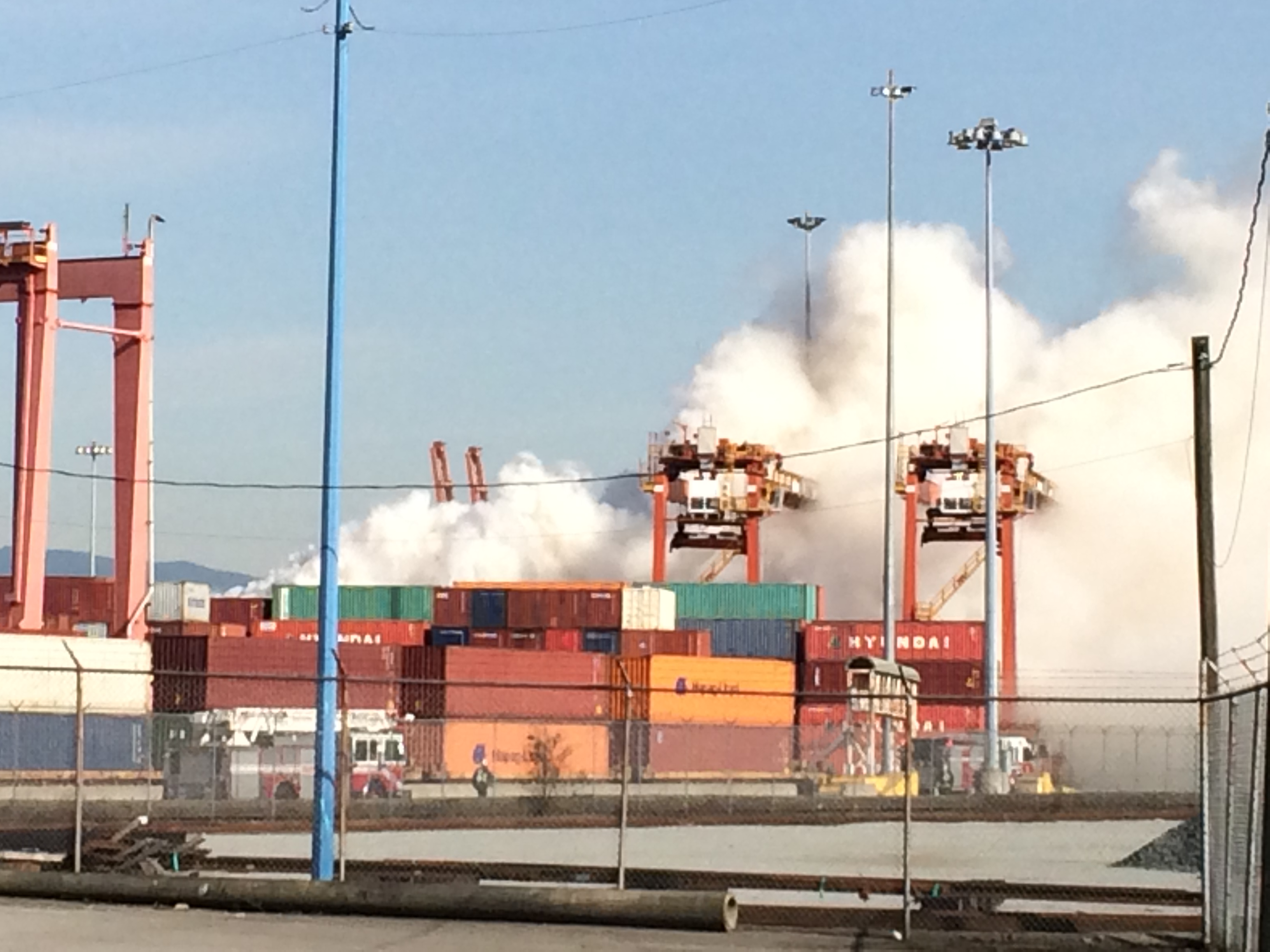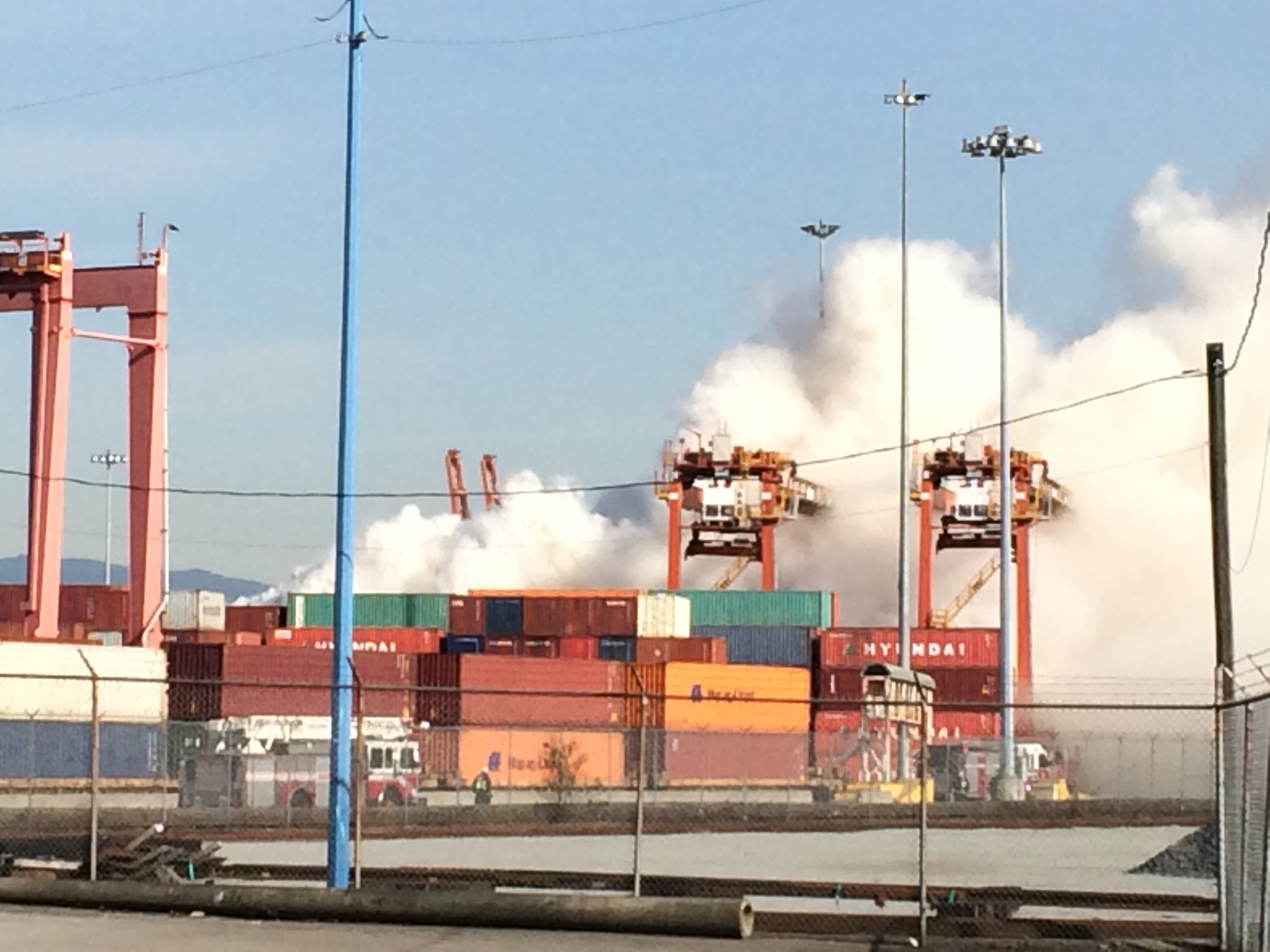 Trichloroisocyanuric acid (a bleaching agent and industrial disinfectant) was burning for more than an hour. The fire started in one shipping container, quickly spreading to three containers. Fire crews had a difficult time reaching the container because it was buried in the middle of a pile of containers – six deep on each side, and two high from the ground. Its exact cause is not known.