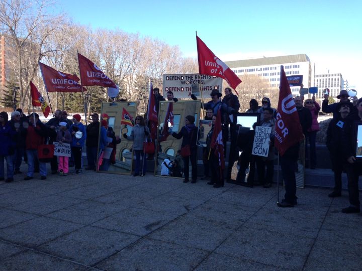 Chanting the words, “Mirror, mirror, on the wall, who’s to blame for this shortfall,” protesters directed their mirrors toward the legislature to demonstrate who they think is responsible for the province’s current fiscal crisis.