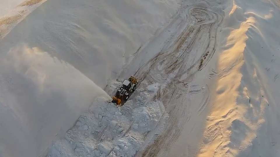 The massive amount of snow even manages to dwarf the equipment that can be seen seen maintaining the site in the video.