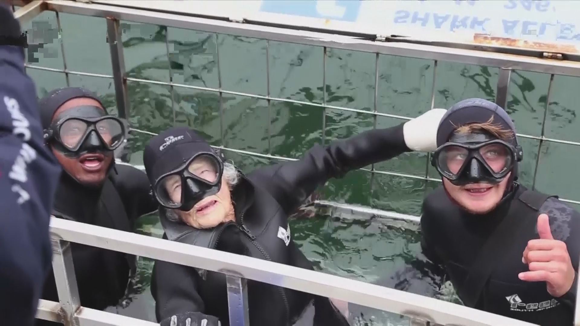 Joined by her close family members, including her great-grandson, she braved the cold waters to meet the notorious great white shark face to face.