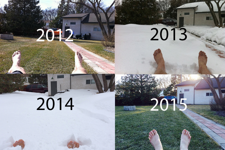 In 2012, MacKay was enjoying the unseasonable 19.2 C weather on March 17; in 2013, his bare feet were in danger of freezing in the unseasonable -27.8 C on March 17; the copious snow buried his feet on March 17, 2014.