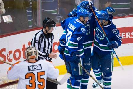 Back in the lineup after missing Saturday’s win over the Toronto Maple Leafs with a groin injury, Burrows snapped a 1-1 tie at 6:44, ripping a shot five-hole on Steve Mason after taking a feed from Daniel Sedin off the rush.