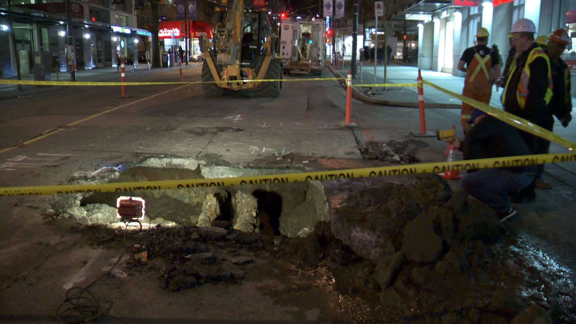 City crews have spent the night working to fix a gaping hole in a downtown Vancouver street in time for the morning commute.