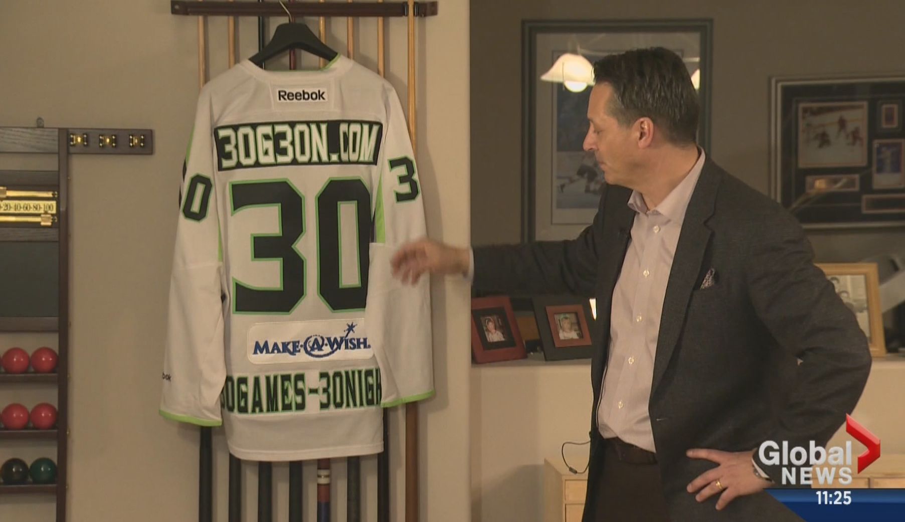 He’s doing it all with a carry-on bag so he can speed through airports. Switching it up with some fresh T-shirts underneath, he pulls on the same jersey for each game to promote his 30games-30nights.com website and the Make-A-Wish Foundation.