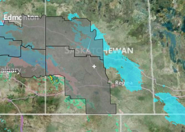At 7:40 p.m. weather radar is showing an area of freezing rain extending from just southwest of Kindersley southeast through Swift Current. This system is expected to track eastward throughout the evening reaching the Moose Jaw area late Saturday evening.