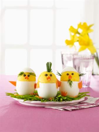 Woman’s Day suggests turning deviled eggs into cute chicks; a plateful helps decorate the buffet table.