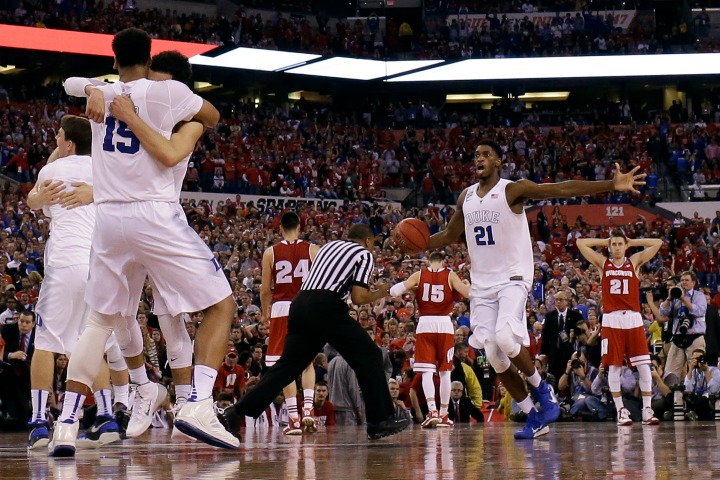 Okafor, the likely first pick in the NBA draft if he decides to leave, got outplayed by Badgers centre Frank Kaminsky most of the night but came through like a veteran when the pressure was highest. The 6-foot-11 freshman made two straight buckets over Kaminsky, sandwiched between a pair of 3-pointers from Jones, to help the Blue Devils (35-4) turn a one-time nine-point deficit into an eight-point lead with 1:22 left.