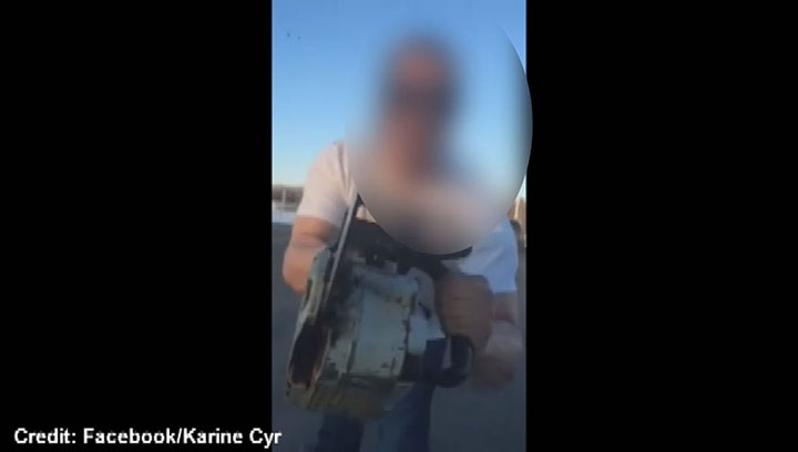 The video shows Manuel Delisle, 36, wielding a chainsaw and yelling at occupants of a car.