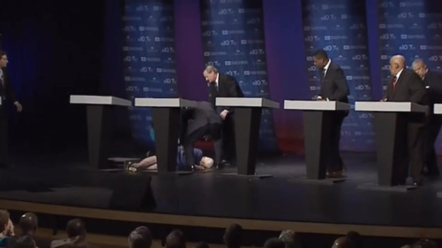 The doctor helped Abraham back to her feet, and she went backstage to receive medical attention while the debate resumed a short time later.