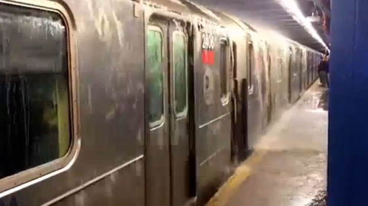Video footage shows water gushing down on top of the subway cars with passengers still inside the train.