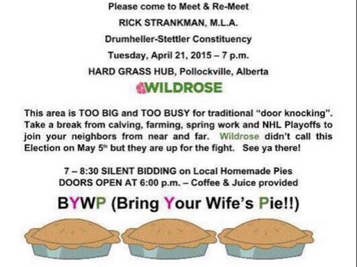 CALGARY – Harmless or sexist? Twitter users are divided over a Wildrose candidate’s poster that asked supporters to bring their wives’ pies to an “old fashioned pie” meet-and-greet event for the party.