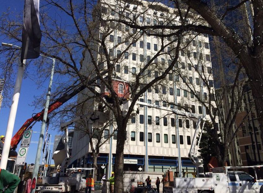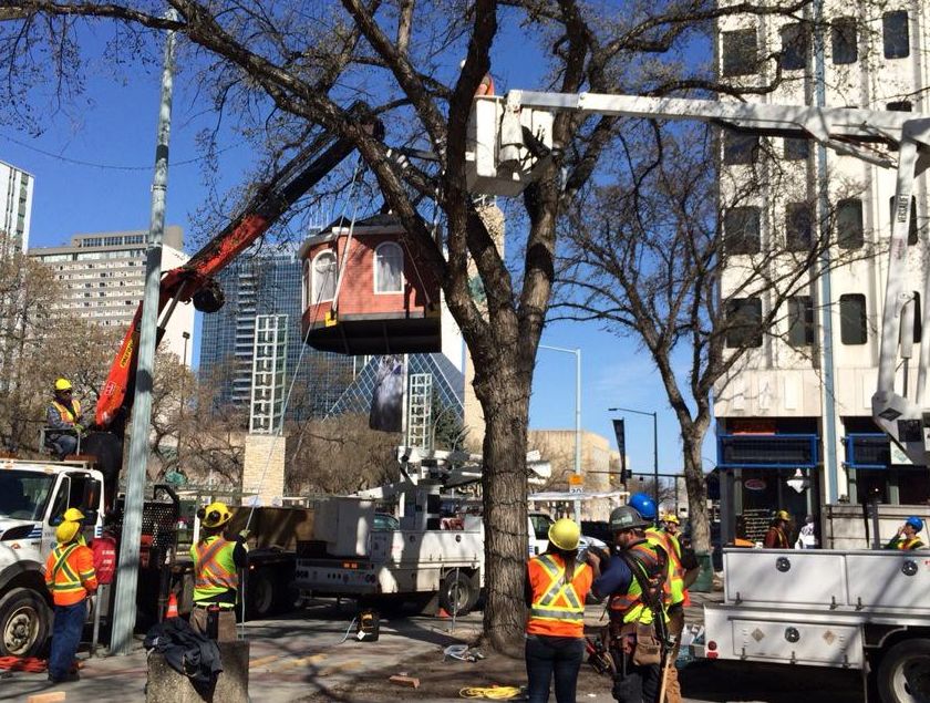 EDMONTON — It’s not a sight often seen in downtown Edmonton, but on Monday, some very realistic miniature houses were being hoisted into the trees above Churchill Square.