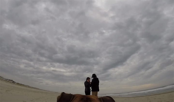 Gies strapped a GoPro camera to Roo (short for Rosseau) and then proposed to Wiseman on the beach in Ocen City, NJ where the couple first met.