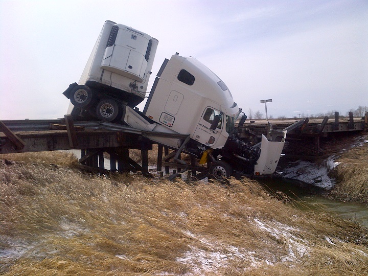 WINNIPEG – A highway just east of Winnipeg was closed Tuesday after a tractor-trailer crashed and was left hanging over a bridge.