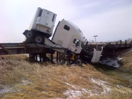 The truck crashed though the guardrail on the bridge over Cooks Creek with the cab hanging over the bridge. The driver wasn’t hurt.